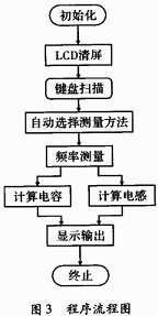 系統(tǒng)上電初始化并且清屏,單片機(jī)初始化完成后,進(jìn)入鍵盤掃描程序,當(dāng)要進(jìn)行電容或電感測量時(shí),選擇測量按鍵,系統(tǒng)進(jìn)行自動判斷并進(jìn)行電容或電感的測量。當(dāng)判斷為電容時(shí),系統(tǒng)選擇電容的計(jì)算方法。當(dāng)判斷為電感時(shí),系統(tǒng)選擇電感的計(jì)算方法。計(jì)算完成后在液晶屏上顯示測量結(jié)果。下面是具體的程序流程圖,如圖3所示。