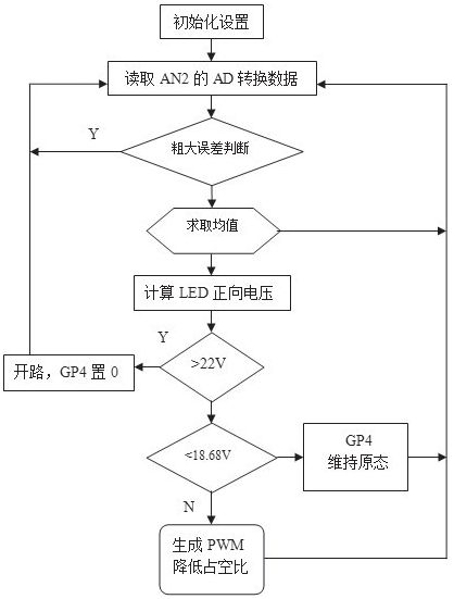PIC12F675初始設(shè)置GP4輸出高電平,如測得LED正向電壓在合理范圍內(nèi),則維持高電平輸出使LM3404正常工作;如LED正向電壓逐漸變低并低于設(shè)定值18.68V,則在GP4引腳輸出PWM信號(hào),其占空比可依次降低,直至LED正向電壓低于設(shè)定值。當(dāng)測得LED正向電壓很高時(shí)可判定輸出開路, PIC12F675可輸出低電平關(guān)閉LM3404的輸出。