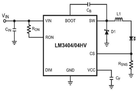 LM3404應(yīng)用十分簡單,一個(gè)用LM3404的典型應(yīng)用如圖6所示。