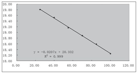 因測試時(shí)間較短,可以將測量時(shí)恒溫箱設(shè)置溫度近似等于LED光源的結(jié)溫。在600mA恒流的情況下,通過數(shù)學(xué)方法不難得出光源模塊正向電壓與結(jié)溫的關(guān)系。利用Excel工具,以溫度為X軸,平均值為Y軸,生成(X,Y)散點(diǎn)圖,選擇線性回歸分析類型則可生成如下趨勢圖和公式。