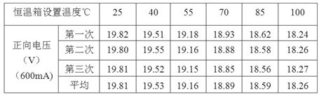 確定正向電壓與結(jié)溫的關(guān)系的試驗(yàn)步驟為:1)將光源置入恒溫箱中;2)設(shè)置恒溫箱的溫度;3)待恒溫箱內(nèi)溫度充分平衡穩(wěn)定后,在光源兩端接入恒流源;4)迅速測量光源的正向電壓并記錄;5)重復(fù)上述步驟1)~(4),恒溫箱溫度由低到高,測得多點(diǎn)數(shù)據(jù)。