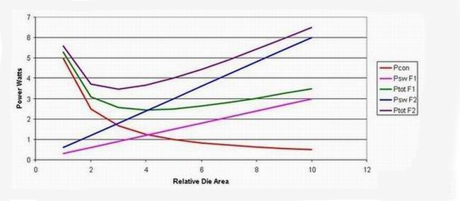 開(kāi)關(guān)損耗與 MOSFET 開(kāi)關(guān)的速度以及 MOSFET 具有多少輸入和輸出電容有關(guān)。這些都與器件尺寸的大小相關(guān)。大體積器件具有較慢的開(kāi)關(guān)速度以及更多的電容。圖 2 顯示了兩種不同工作頻率 (F) 的關(guān)系。傳導(dǎo)損耗 (Pcon)與工作頻率無(wú)關(guān),而開(kāi)關(guān)損耗 (Psw F1 和 Psw F2) 與工作頻率成正比例關(guān)系。因此更高的工作頻率 (Psw F2) 會(huì)產(chǎn)生更高的開(kāi)關(guān)損耗。當(dāng)開(kāi)關(guān)損耗和傳導(dǎo)損耗相等時(shí),每種工作頻率的總損耗最低。另外,隨著工作頻率提高,總損耗將更高。