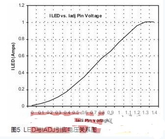 圖4顯示了測(cè)得的LED電流與IADJ引腳和Gnd之間的電位器電阻的關(guān)系圖。1Amp處的平頂表示最大額定LED電流,該值由圖4中所示的電流檢測(cè)電阻 RSNS設(shè)置。