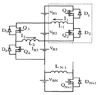 開關(guān)電感法可以實現(xiàn)相鄰電池單體間能量的同時傳遞,可以減少均衡時間,對于N 個蓄電池單體,需要2N-2 個MOSFET 和N-1 個電感。