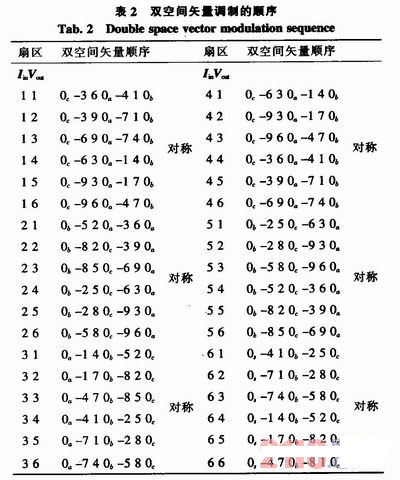 空間矢量調(diào)制法只確定開(kāi)關(guān)間隔中應(yīng)用電壓矢量的占空比,從而獲得低頻率的輸出電壓和輸入電流的平均值,但是并沒(méi)有確定使用的順序。所以需要使用雙空間矢量調(diào)制法,同時(shí)也可改善波形的質(zhì)量。圖2表明了輸入電流在4扇區(qū),輸出電壓在5扇區(qū)應(yīng)用雙空間矢量調(diào)制的順序。電壓矢量在開(kāi)關(guān)間隔中對(duì)稱分布,零矢量每4個(gè)開(kāi)關(guān)間隔使用一次。在每次開(kāi)關(guān)轉(zhuǎn)換中只有一個(gè)開(kāi)關(guān)狀態(tài)發(fā)生改變以最大程度地降低損耗。在圖2中通過(guò)表格2確定相應(yīng)開(kāi)關(guān)時(shí)間: