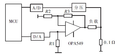 在該電源系統(tǒng)中, 主要為負載提供大電流, 采用PID 控制算法控制負載的發(fā)光強度。輸入為單片機經DAC輸出的控制電壓, 一路為比例放大電路, 如圖1 所示增益G=1+R3/R2.電流型DAC 通過R1 轉換成電壓, 控制OPA549 .輸出電流經采樣電阻轉換為采樣電壓, 送入A/D 轉換器反饋至單片機進行偏差值補償。