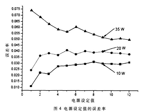 由于輸出電流達到8 A, 對電源的功率要求較高, 易產生噪聲, 這種隨機噪聲也會對輸出電流產生一定的影響。為減弱這種噪聲, 各個模塊分別供電, 以減少交叉干擾, 同時在電路板上多加裝去耦濾波電容, 減小干擾的影響, 同時OPA549 能有效地抑制紋波。影響電源穩(wěn)定性的因素很多, 如負載的變化、取樣電阻的變化、A/D、D/A 的影響等。如圖4 所示, 不同負載的情況下, 電源誤差不同。10 W 的負載, 由于功率較低, 在電壓、電流增加時, 誤差變化也較小。35 W 的負載, 由于功率較大, 工作電流的變化范圍比較大, 功耗較大, 電源的誤差變化相應地也比較大。如圖5, 在10 W、20 W 和35 W 的負載時, 工作狀態(tài)穩(wěn)定, 能夠滿足大電流、大功率的需要。