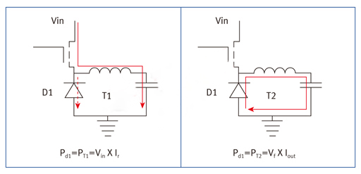當(dāng)時(shí)間為T2時(shí),輸出電流(Iout)流經(jīng)D1。所產(chǎn)生的損耗與D1的正向電壓(Vfw)和輸出電流直接相關(guān)。PT2等于Iout*Vfw。顯然,我們希望盡可能降低以控制損耗,減少發(fā)熱。