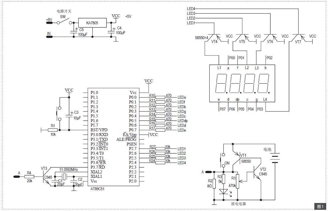 各種電池兩小時率電流放電能夠維持的放電時間一般都是在1.5小時以下的。這里單片機計時系統(tǒng)使用秒計時,4位LED數(shù)碼管顯示。最大計時時間9999秒,大約2.7小時。