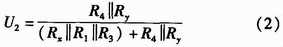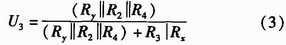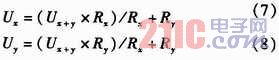 如圖2所示,U+和U-為被測線路的母線供電電壓,正常工作時兩母線間的電壓差Ux+y為440 V,且隨蓄電池內(nèi)阻變化。Rx,Ry分別為被測線路的正母線絕緣電阻和負(fù)母線絕緣電阻。正、負(fù)母線絕緣電阻反映的是64路的正、負(fù)支路的總體絕緣性能,等效于各個支路的正、負(fù)絕緣電阻的并聯(lián),正常時兩母線絕緣電阻>20 kΩ。Ux和Uy為正負(fù)母線對地電壓,大小隨正負(fù)母線的絕緣電阻變化,但兩母線電壓差恒定為Ux+y。為了檢測正負(fù)母線電壓Ux,Uy,Rx,Ry,系統(tǒng)采用了“平衡-不平衡檢測法”檢測母線電壓和母線絕緣電阻。計(jì)算公式如式(1)所示。