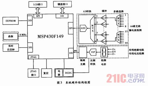 直流接地檢測系統(tǒng)采用低功耗處理器MSP430F149為硬件核心,外圍電路可分為數(shù)據(jù)采集模塊、人機(jī)交互模塊、處理器模塊。數(shù)據(jù)采集模塊負(fù)責(zé)檢測64路支路的漏電流、母線電壓、母線絕緣電阻;人機(jī)交互模塊負(fù)責(zé)進(jìn)行液晶顯示和鍵盤輸入;處理器模塊負(fù)責(zé)協(xié)調(diào)整個系統(tǒng)的數(shù)據(jù)處理,數(shù)據(jù)存儲,人機(jī)交互等。具體的硬件結(jié)構(gòu)框圖,如圖3所示。
