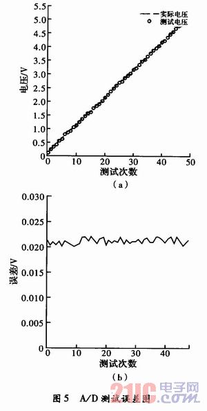 為了達(dá)到好的測試效果,A/D采集必須達(dá)到一定的測試精度,圖5是A/D采集的實(shí)測數(shù)據(jù)和測試誤差分析曲線,從圖中可以看出,A/D采集的誤差約20 mV,屬于正常范圍,因?yàn)橄到y(tǒng)采用8位A/D,5 V基準(zhǔn)電壓。這個采樣精度滿足整體的設(shè)計(jì)要求。