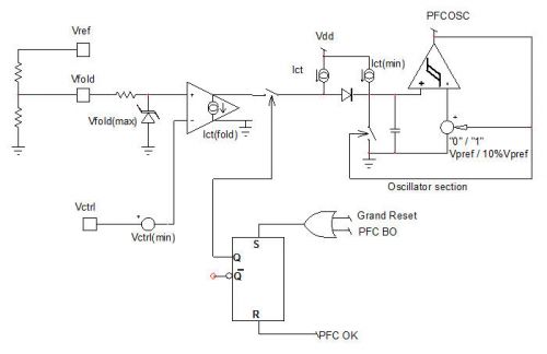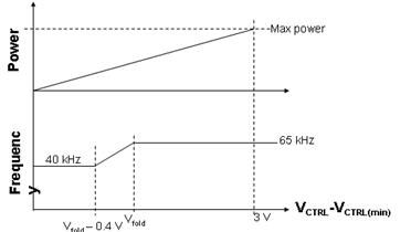 VCTRL與功率及頻率的關(guān)系:當(dāng)輸出功率下降時,VCTRL隨之下降;當(dāng)?shù)竭_(dá)反走設(shè)定點時,頻率線性下降;65 kHz版本將最小頻率內(nèi)部設(shè)定為40 kHz。