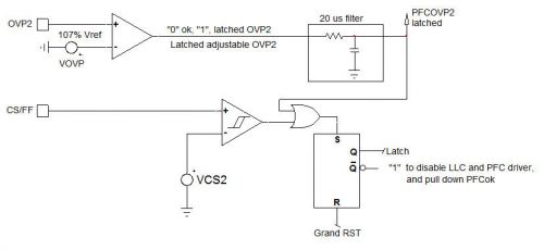 3. 冗余OVP(閂鎖):專用OVP2引腳用來保護(hù)大電容;電路中內(nèi)置的20 µs濾波器用來提供更佳的噪聲免疫性。當(dāng)OVP2比較器被觸發(fā)時,PFC及LLC均關(guān)閉。PFCok信號假定為低電平時,PGout被釋放開路,使LLC停止工作。