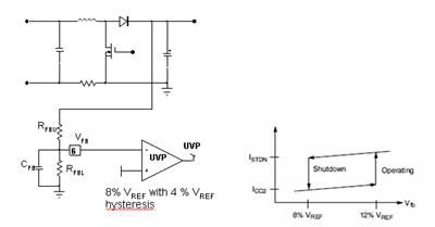 5. 欠壓保護(hù)(UVP)/反饋環(huán)路異常保護(hù):UVP可以防止在反饋故障條件下啟動。當(dāng)VFB < 8% VPREF = 0.2 V時,UVP激活,器件關(guān)閉;當(dāng)VFB高于12% VPREF = 0.3 V時,器件自動開始工作。