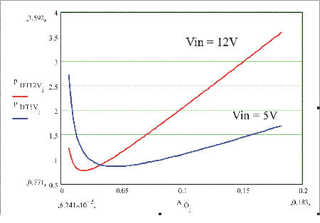 如圖5所示,功耗是裸片面積的函數(shù),周圍是針對輸入電壓為5到12V的頂部MOSFET的最合適值。這清楚地表面,損耗高度依賴于裸片面積以及如果裸片面積增加或減少時這些損耗所增加或減小的劇烈程度。