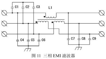 在電源電纜上的干擾具有共模和差模電流分量,在IGBT逆變焊機(jī)中共模干擾是主要治理對(duì)象,圖11是一種共模、差模兼顧的三相EMI濾波器。C4~C9、L1主要用于共模干擾的濾出,L1的漏抗和C1~3用于差模干擾的濾出。