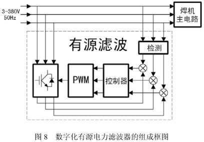 有源濾波器原理如圖 8 所示。通過(guò)檢測(cè)電路對(duì)負(fù)載端(焊機(jī)主電路)的電壓、電流進(jìn)行檢測(cè),然后送入控制電路進(jìn)行計(jì)算分析,輸出相應(yīng)的脈沖驅(qū)動(dòng) IGBT,產(chǎn)生與負(fù)載電流中的諧波電流大小相等方向相反的電流,從而達(dá)到補(bǔ)償負(fù)載電流中的諧波分量和無(wú)功功率的目的。逆變器工作時(shí)所需要的能量由儲(chǔ)能電路供給,該儲(chǔ)能電路是通過(guò)逆變器中的各個(gè) IGBT 的反并聯(lián)二極管進(jìn)行充電,同時(shí)又在 IGBT 開(kāi)通時(shí)輸出能量,使諧波電流分量和無(wú)功功率得到補(bǔ)償。這樣,電網(wǎng)的輸入電流可實(shí)現(xiàn)為正弦波形。 有源濾波器動(dòng)態(tài)響應(yīng)迅速,濾除諧波可達(dá)到 95%以上,補(bǔ)償無(wú)功細(xì)致。但有源濾波器由于電路復(fù)雜,材料成本高,運(yùn)行可靠性也不及無(wú)源濾波電路,對(duì)市場(chǎng)價(jià)格競(jìng)爭(zhēng)異常激烈的 ZX7、NB 系列逆變焊機(jī)而言不太適用,但對(duì)需要作精細(xì)控制的數(shù)字化焊機(jī)而言,可能有源濾波才是其最佳選擇。