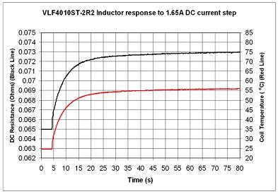圖5中所示的測(cè)試示例在LM3554的電路中使用了VLS4010ST-2R2,直流電流階躍為1.65A。室溫時(shí)的電阻開始時(shí)為65mΩ。超過30秒之后,電感器達(dá)到穩(wěn)態(tài),電阻變?yōu)?3mΩ,相應(yīng)的穩(wěn)態(tài)工作溫度大約為 56℃。