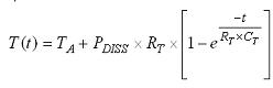 在穩(wěn)態(tài)下,LEDI/NTC的ESD二極管的VF為-622mV,對(duì)應(yīng)結(jié)溫 95.2℃(環(huán)境溫度為25℃時(shí))。在穩(wěn)定狀態(tài)下,測(cè)得的PFET導(dǎo)通電阻為154mΩ,對(duì)應(yīng)結(jié)溫105℃。圖3 還描繪了LM3554的熱容。VF和RPMOS的響應(yīng)表現(xiàn)呈現(xiàn)類似于一階RC的指數(shù)級(jí)上升,計(jì)算等式如下: