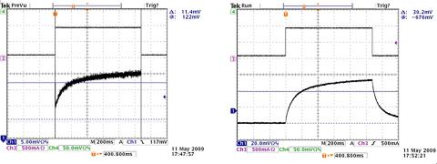 因?yàn)殡娏饔行┹p微依賴MOSFET的導(dǎo)通電阻,所以有必要在電流接近目標(biāo)閃光電流時(shí)測(cè)量 PFET電阻。使用大測(cè)試電流的問題是它們可能導(dǎo)致器件發(fā)熱??朔藛栴}的方法是將閃光超時(shí)時(shí)間設(shè)置為最低 32ms,并在示波器上測(cè)量PFET的電壓降。在+25℃到+125℃的情況下,使用1.2A閃光電流,結(jié)果顯示的斜率大約為 0.42mΩ/℃ 。要注意的一個(gè)事情是PFET通過VOUT引腳供電,因此VOUT=5V時(shí),其導(dǎo)通電阻會(huì)低于VOUT=3.9V時(shí)的電阻值。