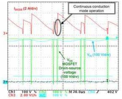 圖4顯示出現(xiàn)不穩(wěn)定性問題時(shí)高輸入線路(正弦波頂端,此處Vin約為380V)下的VAUX電壓。我們可以看到MOSFET關(guān)閉時(shí),VAUX電壓輕微躍升至高于ZCD閾值。由于其大紋波的緣故,在退磁相位期間,VAUX電壓首先增加,然后下降。由于在某些開關(guān)周期的末段VAUX接近ZCD閾值,這VAUX電壓下降導(dǎo)致零電壓比較器在電感磁芯完全復(fù)位前就翻轉(zhuǎn)(trip)。圖5證實(shí)了這一論斷。有時(shí),升壓二極管仍在導(dǎo)電時(shí),PFC段開始新的周期。這個(gè)現(xiàn)象主要導(dǎo)致線路電流失真(見紅色跡線)、功率因數(shù)退化,并可能有一些頻率處在人耳可聽到的噪聲。