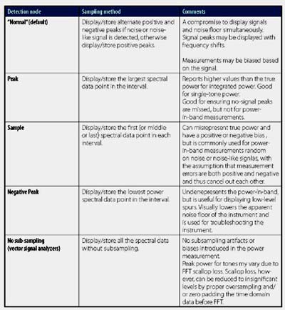 檢測(cè)模式是另一種幅度控制方式,可用于傳統(tǒng)的掃描頻譜分析儀,但不能用于基于FFT的分析儀??煞譃槠胀?、峰值、采樣或負(fù)峰值等模式,具體檢測(cè)模式?jīng)Q定了頻譜分析儀如何減少頻譜信息的,或者說如何壓縮頻譜信息。