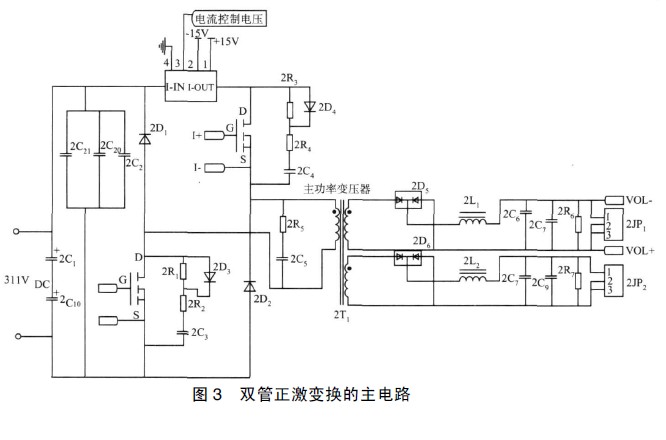 從圖3 可以看出, 電路結(jié)構(gòu)簡單, 容易實現(xiàn), 并在MOSFET 橋臂增加了霍爾傳感器, 以保證輸出反饋電流環(huán)的要求。為了增加電路的通用性, 設(shè)計的電路板增加了雙路輸出的功能, 只要改變變壓器的設(shè)計, 即可以完成多路輸出。當兩個主功率開關(guān)管截止時, 原邊繞組的電壓極性相反, 使另外一橋臂的兩個二極管導通, 電壓被箝位在輸入電壓值。因此開關(guān)管承受的電壓與輸入電壓相同。在輸入電壓最大值低于350 V時, 開關(guān)管只需要選擇450 V 的耐壓值即可。這里我們選用N 溝道MOSFET , IRF830( 4. 5 A/ 500 V) 。