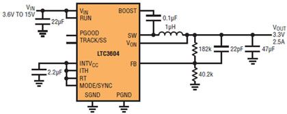 工作頻率在 800kHz 至 4MHz 范圍內(nèi),可用一個 RT 到地之間的外部電阻器編程。就開關(guān)噪聲敏感應(yīng)用而言,LTC3601 和 LTC3604 可在相同的頻率范圍內(nèi)從外部同步,而不管 RT 的狀態(tài)如何。無需外部 PLL 組件實(shí)現(xiàn)同步。