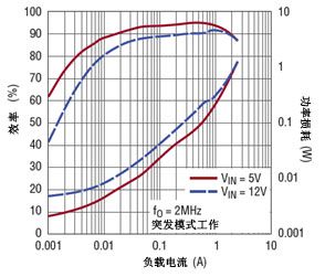 這兩款 IC 都能以可選的突發(fā)模式 (Burst Mode®) 工作,以在小負(fù)載電流時實(shí)現(xiàn)卓越的效率 (圖 4),又或者可采用強(qiáng)制連續(xù)模式,該模式舍棄輕負(fù)載效率,以換取最小輸出紋波和恒定頻率工作。即使這樣,以突發(fā)模式工作時的紋波一般也僅為 20mV。