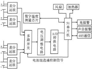 具有高電壓、高容量、循環(huán)壽命長、安全性能好等優(yōu)點(diǎn)的鋰離子電池,在便攜式電子設(shè)備、電動汽車、空間技術(shù)、國防工業(yè)等多方面具有廣闊的應(yīng)用前景。由若干節(jié)鋰離子電池經(jīng)串聯(lián)組成的動力鋰離子電池組目前應(yīng)用最為廣泛。由于每節(jié)單體電池的電壓不一致,使用中電池不允許過充電、過放電,電池的性能和壽命受溫度影響較大等特點(diǎn),必須對串聯(lián)鋰離子電池組進(jìn)行監(jiān)測,確保在使用中鋰離子電池具有良好的狀態(tài),或者使用中電池出現(xiàn)問題立即報(bào)警,電源管理系統(tǒng)立即采取保障措施,并提醒相關(guān)人員檢修。單體電壓和電池組的溫度是辨別串聯(lián)鋰離子電池組是否正常工作的主要技術(shù)指標(biāo)。文獻(xiàn)[1]采用直接采樣法,將要測量的單體電池電壓存儲在非電容上進(jìn)行測量。該方法反應(yīng)時(shí)間慢、誤差較大、控制復(fù)雜;文獻(xiàn)[2]采用運(yùn)放和光藕繼電器來測量串聯(lián)電池組的單體電壓。該方法對光耦的線性度要求很高,導(dǎo)致硬件成本較高。目前,直接采用集成芯片的串聯(lián)鋰離子電池組監(jiān)控系統(tǒng)受到青睞,但該方法串聯(lián)電池的數(shù)目固定,導(dǎo)致應(yīng)用不靈活、硬件成本高等缺點(diǎn)。文中研制了一種動力鋰離子電池組監(jiān)測系統(tǒng),對串聯(lián)鋰離子電池組的單體電壓和電池組的溫度進(jìn)行在線監(jiān)測,當(dāng)單體電池電壓偏離規(guī)定區(qū)間時(shí),監(jiān)測系統(tǒng)啟動報(bào)警程序進(jìn)行聲、光報(bào)警;當(dāng)電池組溫度偏離規(guī)定的區(qū)間時(shí),監(jiān)測系統(tǒng)啟動風(fēng)扇或加熱控制電路,并存儲有關(guān)數(shù)據(jù),確保電池組正常工作。整個(gè)監(jiān)測系統(tǒng)具有連續(xù)測量分量、簡單經(jīng)濟(jì)、精度高和可靠性高的特點(diǎn)。