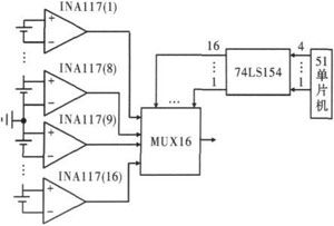 該檢測系統(tǒng)采用16個(gè)INA117分別把16節(jié)鋰離子電池的單體電壓挑選出來。如果它們的1腳都接相同的地,就可以使16個(gè)INA117都有相同的信號地,A/D轉(zhuǎn)換器進(jìn)行采樣。共地點(diǎn)選在第8節(jié)電池負(fù)極和第9節(jié)電池正極的連接處。
