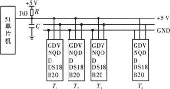 針對串聯(lián)電池組,傳統(tǒng)的測溫方法多采用模擬溫度傳感器進(jìn)行測量,在數(shù)據(jù)的采集和傳輸過程中易受外界環(huán)境的干擾,從而使測得的結(jié)果誤差較大,且當(dāng)測量點(diǎn)較多時(shí),連線較復(fù)雜。文中采用單片機(jī)和單總線數(shù)字式溫度傳感器DS18B20來解決上述問題[5]。其原理如圖5所示。