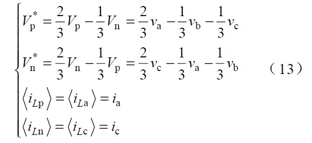 圖中 Vp 、Vn 為不同區(qū)間所對(duì)應(yīng)的電壓,Lp、 Ln 和Lt 為不同區(qū)間所對(duì)應(yīng)的電感,Tp、 Tn 為不同區(qū)間所對(duì)應(yīng)的主控開關(guān),dp 、dn 為主控開關(guān)的占空比。由于PWM 開關(guān)頻率遠(yuǎn)高于電網(wǎng)頻率,因此,在一個(gè)開關(guān)周期內(nèi),各電感的電壓平均值為零,運(yùn)用回路電流法和節(jié)點(diǎn)電壓法對(duì)各種開關(guān)狀態(tài)進(jìn)行分,析可得出:
