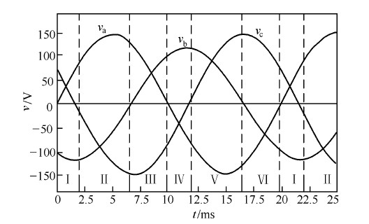 圖 1 給出了雙并聯(lián)升壓型三相整流器的主電路原理圖。另外,圖2 還給出了輸入電壓b 相幅值減少20% ,c 相相位滯后30 °時(shí)三相電壓的波形,并按虛線劃分為六個(gè)區(qū)間。須注意的是,輸入電壓不對(duì)稱的情況不同,其分區(qū)點(diǎn)也可能不同,分區(qū)點(diǎn)由各相非零序電壓瞬時(shí)最大幅度區(qū)分點(diǎn)所確定。依據(jù)六階段PWM 控制技術(shù)原理,三相整流器可以通過(guò)在線性周期的每一區(qū)間內(nèi)控制兩個(gè)開關(guān)的通斷來(lái)實(shí)現(xiàn)單位功率因數(shù)。