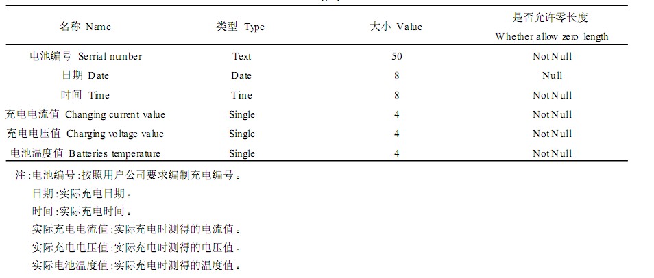本系統(tǒng)設(shè)計(jì)了三個(gè)數(shù)據(jù)庫(kù),用于標(biāo)準(zhǔn)充電曲線存儲(chǔ)、實(shí)際充電曲線存儲(chǔ)及分析結(jié)果存儲(chǔ)。使用VB6. 0提供的數(shù)據(jù)庫(kù)管理工具"可視化數(shù)據(jù)管理器"建立。其中實(shí)際充電曲線數(shù)據(jù)表如表1所示,數(shù)據(jù)庫(kù)的建立方便了對(duì)電池的查詢、分析,同時(shí)也方便了管理。
