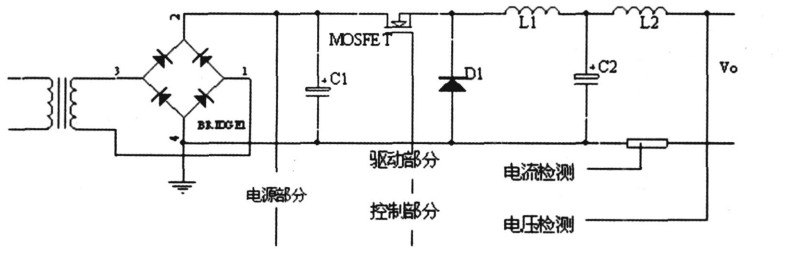 在主充電路中, 220 V電壓經(jīng)變壓器降壓后,由整流器整流和大電容C1 平滑濾波,作為直流充電電源。MOSFET、二極管D1、電感L1 和電容C2 構(gòu)成主充電路。在工作過(guò)程中, PWM控制信號(hào)的高電平脈沖出現(xiàn),使MOSFET導(dǎo)通之后,電感L1 的電流不斷增大,電容C2 充電,主充變換器不斷存儲(chǔ)能量,同時(shí)通過(guò)電感L2 對(duì)電池充電,此時(shí),續(xù)流二極管因反向偏置而截止。經(jīng)過(guò)PWM高電平脈沖持續(xù)時(shí)間后, PWM信號(hào)變低,MOSFET截止,電感L1 中的電流減小, L1 兩端的感應(yīng)電動(dòng)勢(shì)使續(xù)流二極管導(dǎo)通, L1 中的存儲(chǔ)電流和電容C2 存儲(chǔ)電荷向電池充電。經(jīng)過(guò)PWM信號(hào)的低電平持續(xù)時(shí)間后, PWM信號(hào)的又一高電平脈沖到來(lái),再度使MOSFET導(dǎo)通,上述過(guò)程循環(huán)交替。電感L2 的作用是平滑充電電流.