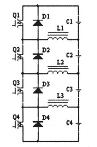 在均衡電路中,以4節(jié)電池為例,當(dāng)對(duì)第二節(jié)電池均衡時(shí),開啟MOS管Q2,蓄電池C2通過(guò)Q2給電感L1、L2充電,然后關(guān)斷MOS管Q2,則電感L1中的電流通過(guò)二極管D1回饋給蓄電池C1,電感L2中的電流通過(guò)二極管D3和D4回饋給蓄電池C3和C4,以達(dá)到各個(gè)單體均衡的效果。