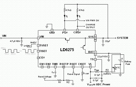 為滿足低耗電可攜式產(chǎn)品對于更精確、更安全的充電器應用需求,許多IC制造商發(fā)展出低成本線性充電器。圖2是以通嘉科技的LD6275充電IC為設(shè)計范例,構(gòu)成僅需少數(shù)外部零件的獨立式線性充電器電路,其具備1.5A的最大充電電流。