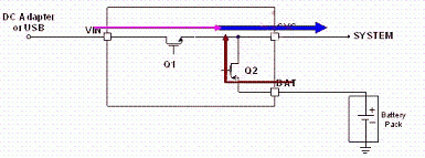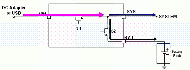LD6275 具有適應性電源路徑管理(Adaptable Power Path Management, APPM)功能,其為以供給系統(tǒng)端用電為主,對電池充電為輔,如圖3所示;當系統(tǒng)用電超過輸入電源的供給限制時,其電池亦能主動開啟放電功能同時對系統(tǒng)端供給其所需之電能需求,如圖4所示。