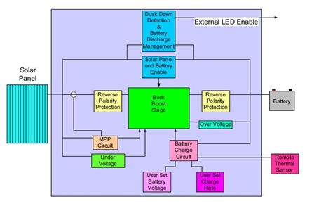 設計工作包括根據功率需求的增加隔離拓撲結構。電池充電狀態(tài)的管理是由適當的充電算法完成的。太陽能電池板安裝技師可以選擇輸出電壓和電池充電速率。由于控制器要連接到太陽能電池板,它必須具有最大功率點跟蹤,為最終客戶提供高價值??刂破饔袃蓚€正使能(Enable)電路,一個電路檢測黑夜時間,另一個檢測電池的充電狀態(tài),使外部電路不會使電池對損壞點放電。由于控制器將由不同程度經驗的現場技術人員和新手安裝,因此重要的是輸入和輸出必須有反向極性保護。另外,控制器和電池可能安裝在過熱或過冷的位置,控制器必須采用電池充電溫度補償。設計還應包括安全功能,如電池過壓檢測和太陽能電池板欠壓檢測。