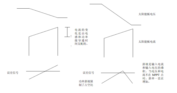 為了從功率可變的電源(即太陽能電池板)析取出最大的功率,太陽能控制器必須采用 MPPT。MPPT 必須首先找到最大功率點并及時調整環(huán)境條件,以保持控制器接近最大功率點。動態(tài) MPPT 用在系統(tǒng)發(fā)生改變的情況下。由于每個開關周期都在發(fā)生變化,太陽能電池板汲取的功率也會在每個周期有明顯的改變。動態(tài)MPPT利用太陽能電池板的電壓驟降乘以每個開關周期增加的電流,以確定將要產生的誤差信號來調節(jié)占空比。動態(tài)響應可檢測 IV 曲線的斜率,從而建立一個功率斜坡,從誤差信號相交點建立一個代表占空比的功率。當斜坡變化斜率從正到負時該周期結束,如圖 2 所示。