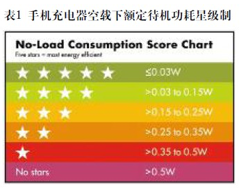 這些關(guān)注的結(jié)果是采取一系列措施來提升效率和降低空載功耗的需求。其中最新最嚴(yán)格的是由全球前五大手機(jī)廠商提出的一項(xiàng)自愿性的充電器星級制協(xié)定,用以標(biāo)志在充電完成之后,充電器仍插在壁式插座上時(shí)的耗能量。該星級制從0星級開始,最高5星級??蛰d下額定待機(jī)功耗大于0.5W的充電器為0星級標(biāo)簽,待機(jī)功耗小于0.03W(30mW)的為5星級(見表1)。通過比較,大多數(shù)現(xiàn)有手機(jī)的待機(jī)功耗在150~300mW范圍。