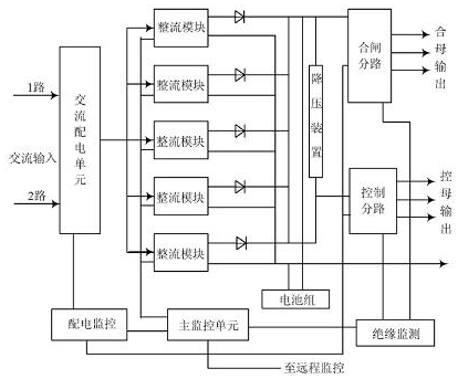 智能高頻開關(guān)電源系統(tǒng)的總體結(jié)構(gòu)主要由主監(jiān)控單元、配電模塊、交流配電單元、整流模塊等組成, 系統(tǒng)總體的結(jié)構(gòu)圖如圖1 所示。系統(tǒng)中的各個(gè)監(jiān)控單元受主監(jiān)控單元的管理和控制,通過通信線將各個(gè)監(jiān)控單元采集的信息送給主監(jiān)控統(tǒng)一管理。主監(jiān)控顯示直流系統(tǒng)各種信息,用戶也可以觸摸顯示屏查詢信息及操作,系統(tǒng)信息還可以接入到遠(yuǎn)程監(jiān)控系統(tǒng)中。系統(tǒng)除了交流監(jiān)控、直流監(jiān)控、開關(guān)量監(jiān)控等基礎(chǔ)單位外,還配置了絕緣監(jiān)測(cè)、降壓裝置、電池巡檢等功能單元,以達(dá)到對(duì)直流系統(tǒng)進(jìn)行全面監(jiān)控的目的。