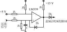 過(guò)流保護(hù)是利用SG3524的腳10加高電平封鎖脈沖輸出的功能。當(dāng)腳10為高電平時(shí),SG3524的腳11及腳14上輸出的脈寬調(diào)制脈沖就會(huì)立即消失而成為零。過(guò)流信號(hào)取自電流互感器(對(duì)SG3524-1芯片串接在工頻變壓器的副邊,對(duì)SG3524-2芯片串接在濾波電路前),經(jīng)整流后得到電流信號(hào)加至如圖6所示過(guò)流保護(hù)電路上。過(guò)流信號(hào)加至電壓比較器LM339的同相端。當(dāng)過(guò)流信號(hào)使同相端電平比反相端參考電平高時(shí),比較器將輸出高電平,則二極管D2將從原來(lái)的反向偏置狀態(tài)轉(zhuǎn)變?yōu)檎驅(qū)ǎ淹喽穗娢惶嵘秊楦唠娖?,這一變化將使得電壓比較器一直穩(wěn)定輸出高電平封鎖脈沖,則Boost電路停止工作,在正常狀態(tài)下,比較器輸出零電平,不影響B(tài)oost電路工作。