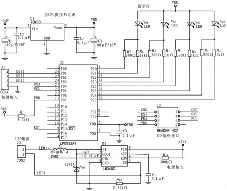 P89LPC932是由飛利浦生產(chǎn)的低功耗單片微處理器,電源電壓3.3V,可低功耗運(yùn)行,適合于許多要求高集成度、低成本的場(chǎng)合??梢詽M足多方面的性能要求。P89LPC932采用了高性能的處理器結(jié)構(gòu),指令執(zhí)行時(shí)間只需2~4個(gè)時(shí)鐘周期,6倍于標(biāo)準(zhǔn)80C51器件。P89LPC932集成了許多系統(tǒng)級(jí)的功能,這樣可大大減少元件的數(shù)目、電路板的面積以及系統(tǒng)的成本,其內(nèi)部有2個(gè)定時(shí)器,可作為一個(gè)具有256個(gè)定時(shí)器時(shí)鐘周期的PWM發(fā)生器使用。LED調(diào)光電路電氣原理圖如圖2所示。
