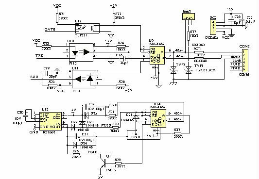 本文設(shè)計(jì)的接口電路主要是針對(duì)工業(yè)現(xiàn)場(chǎng)控制終端,由于各種控制要求不同,所以對(duì)控制終端的配置各異。但總體要求是某一終端故障不應(yīng)影響系統(tǒng)其余部分的功能,要便于終端與監(jiān)控系統(tǒng)之間的接口。所以,本文設(shè)計(jì)中對(duì)于RS-485與RS-232的轉(zhuǎn)換采用了無(wú)源的轉(zhuǎn)換方式,而非常規(guī)的RS-232與RS-485標(biāo)準(zhǔn)轉(zhuǎn)換,既便是與PC相連的終端單元掉電,也不會(huì)影響系統(tǒng)中其它單元的正常通信。
