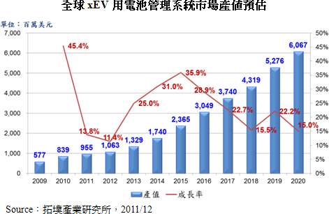 因此,透過BMS能準確量測電池組使用狀況,保護電池不至于過度充放電,平衡電池組中每一顆電池的電量,以及分析計算電池組的電量并轉換為駕駛可理解的續(xù)航力信息,確保動力電池可安全運作。拓墣預測2012年全球BMS市場產值成長逾10%,2013年至2015年成長幅度將大幅躍升至25%~35%。