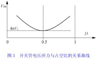 上式說明,當(dāng)變壓器匝比愈小時,對于一定的輸入電壓和輸出電壓的變換器,開關(guān)管電壓應(yīng)力vds愈小。所以,有源鉗位正激變換器一個顯著優(yōu)點是可以降低開關(guān)管電壓應(yīng)力,從而可選用額定電壓較低、通態(tài)電阻較小的功率開關(guān)管。另外,當(dāng)變壓器變比n確定后,開關(guān)管電壓應(yīng)力僅與占空比有關(guān),如圖3所示。顯然,當(dāng)占空比為0.5時,開關(guān)管承受最小的電壓應(yīng)力。當(dāng)輸入電壓變化時,如果將占空比設(shè)計運行在以0.5為中心的對稱范圍內(nèi),則可使開關(guān)管承受的電壓應(yīng)力基本保持恒定。