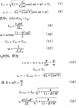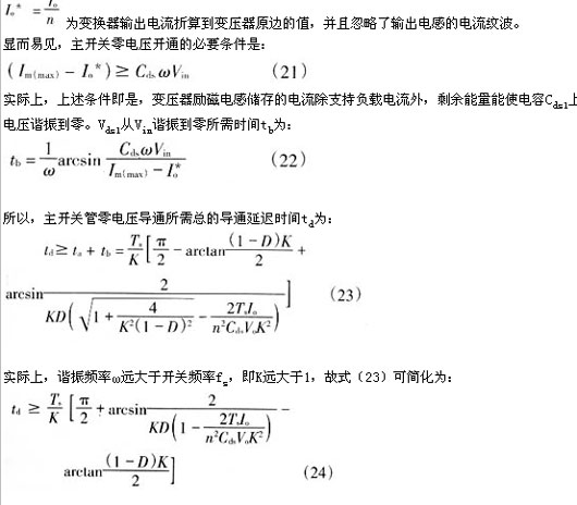 從上面的分析可明顯地看出,當(dāng)變壓器勵磁電感l(wèi)m減小,勵磁電流足夠大時,[t5~t0′]期間勵磁電流除了能提供負載電流外,剩余部分可用來幫助電容cds2、cds1充放電。電壓vds1有可能諧振到零,從而實現(xiàn)主功率開關(guān)管s的零電壓軟開通。二極管d1可為負的勵磁電流續(xù)流。關(guān)鍵工作波形如圖2(b)所示,具體的軟開關(guān)條件將在下一節(jié)中詳細討論。很顯然,軟開關(guān)的代價是變壓器勵磁電流和開關(guān)管導(dǎo)通電流峰值大幅增加,開關(guān)管及變壓器電流應(yīng)力和通態(tài)損耗明顯加大。